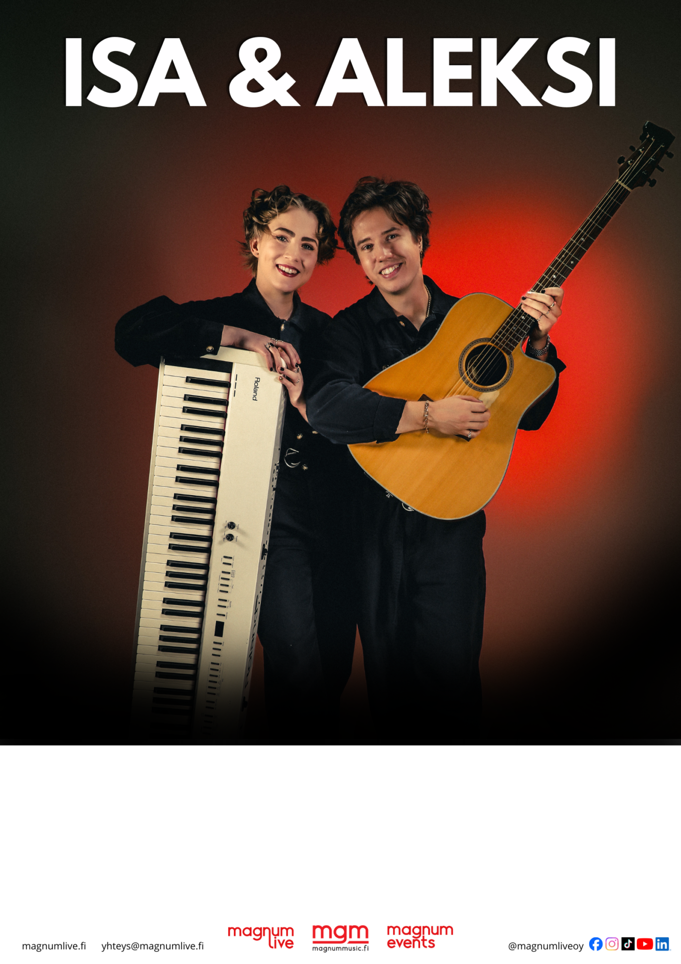 Isa & Aleksi on raikas ja moderni bändin veroinen pop-duo, joka luo käsinkosketeltavan tunnelman heti ensimmäisestä biisistä lähtien. Tämä duo taipuu moneen: sekä tanssittavaan bilemeininkiin että tunnelmalliseen fiilistelyyn! Heidän herkät stemmat ja tulkinta ovat ainutlaatuista koettavaa.